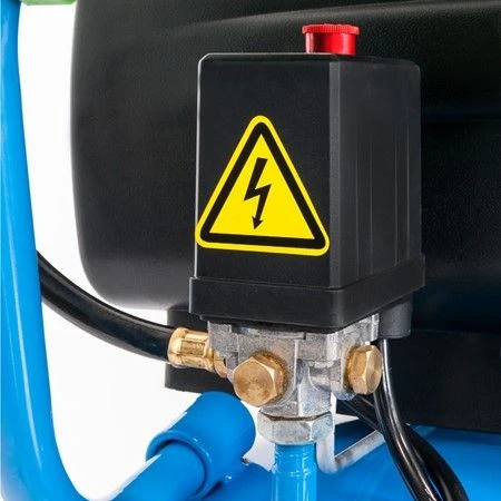 De tank is 50 liter, zodat er veel lucht opgeslagen kan worden en de motor niet constant aan hoeft. De machine is namelijk ook niet geschikt om continu te gebruiken. Het is namelijk het geval dat de machine moet afkoelen en de inschakelduur 30% per 60 minuten betreft. Maar omdat de compressor een grote tank heeft, kunt u een hele tijd vooruit met uw klus en zal de motor niet vaak aangaan. Wel zo prettig wanneer u dicht bij de machine werkt. Met de zwarte draaiknop stelt u eenvoudig de werkdruk in.